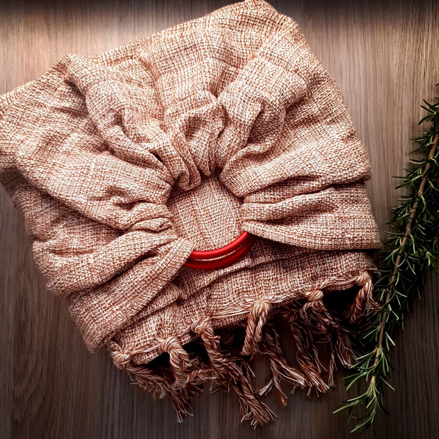 Se você busca menos tecido, o Ring Sling tem por volta de 2m a 2,2m de comprimento e um fácil ajuste através das argolas em alumínio {que são leves e resistentes}.